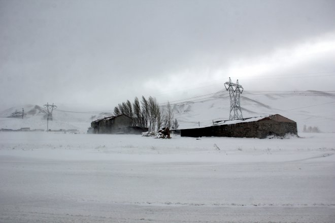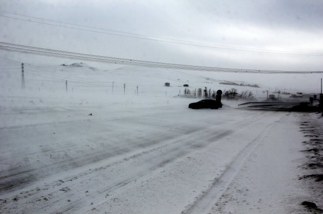 Erzurum’da hızı saatte 60 kilometreyi bulan fırtına kar tipisine dönüştü. Fırtına nedeniyle arazideki karlar savrularak sürgün oluştu.