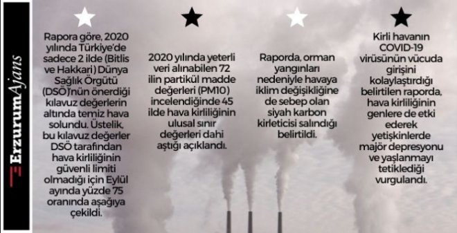 ERZURUM AJANS - Onur SAĞSÖZ / Temiz Hava Hakkı Platformu’nun yayınladığı Kara Rapor 2021’e göre, 2020 yılında Türkiye’deki illerin yarısında, yani 42 şehirde kanserojen olan ince partikül (PM2.5) seviyesi yeterli düzeyde ölçülmedi.