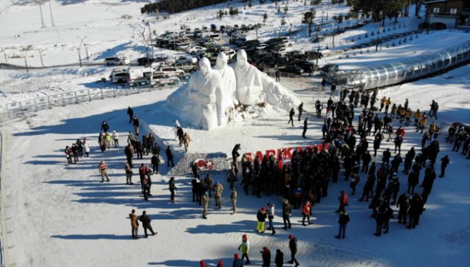 Sarıkamış’ta donarak şehit olan 90 bin askerinin anısına 200 kamyon kar taşınarak yapılan kardan heykellerin açılışını bakanlar Kasapoğlu ve Dönmez yaptı.