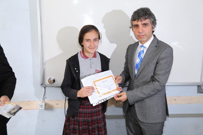 Demir, Oltu Kaymakamı Şenol Turan’ın elinden başarı belgesini alırken okul ikincisine İlçe Milli Eğitim Müdürü Ömer Zengin ve okul üçüncüsüne ise Gökçedere İlköğretim Okulu Müdürü Binali Çakır başarı belgelerini takdim etti. Tüm öğrencilerin belgelerini almasının ardından, öğrenciler karton keplerini hep birlikte havaya attı.