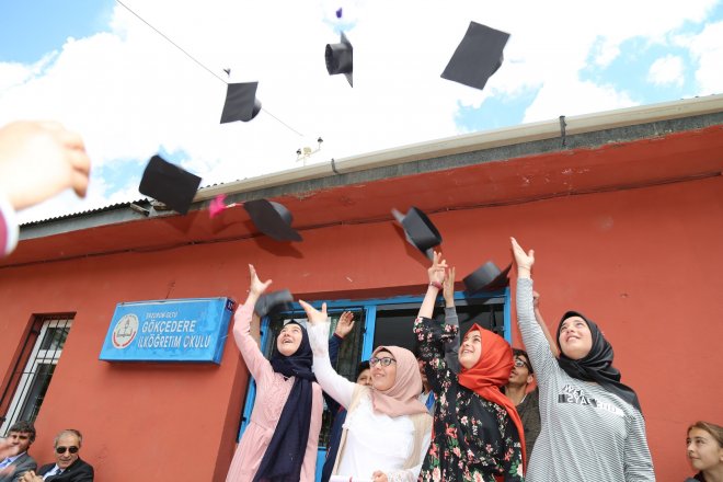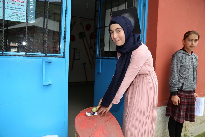 Mezun olan 9 öğrencinin, mezuniyet cübbeleri olmasa da büyük bir titizlikle önceden hazırladıkları kartondan kepleri takarken yaşadıkları coşkularına aileleri de eşlik etti.