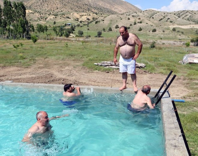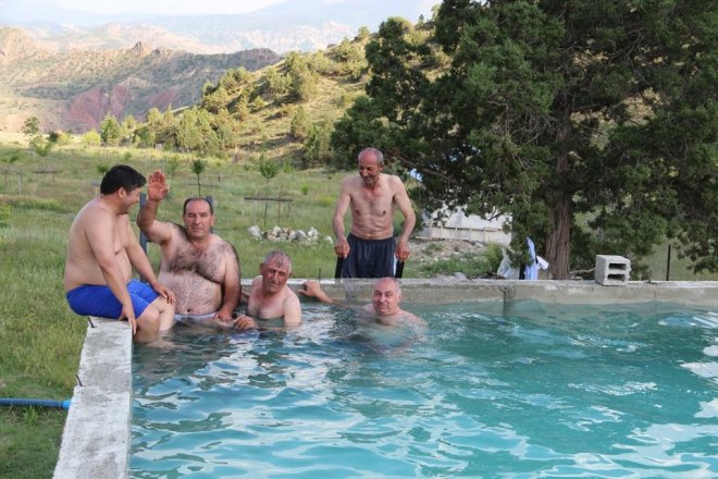 Havuzda serinlemeye çalışan Sait Gür, "İki aydır her gün yağmur yağıyordu. Bugün hava çok güzel güneş mükemmel biz de bugün bahçemdeki sulama havuzuna gelerek arkadaşlarla serinliyoruz." ifadelerini kaydetti.