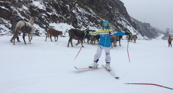 Kar yağışının aralıklarla etkili olduğu merkezde kayak ve snowboard yapanlar, pistlerde bir sürprizle karşılaştı. Sürü halinde kayak merkezinden inen büyükbaş hayvanları gören kayakçılar, gözlerine inanamadı.